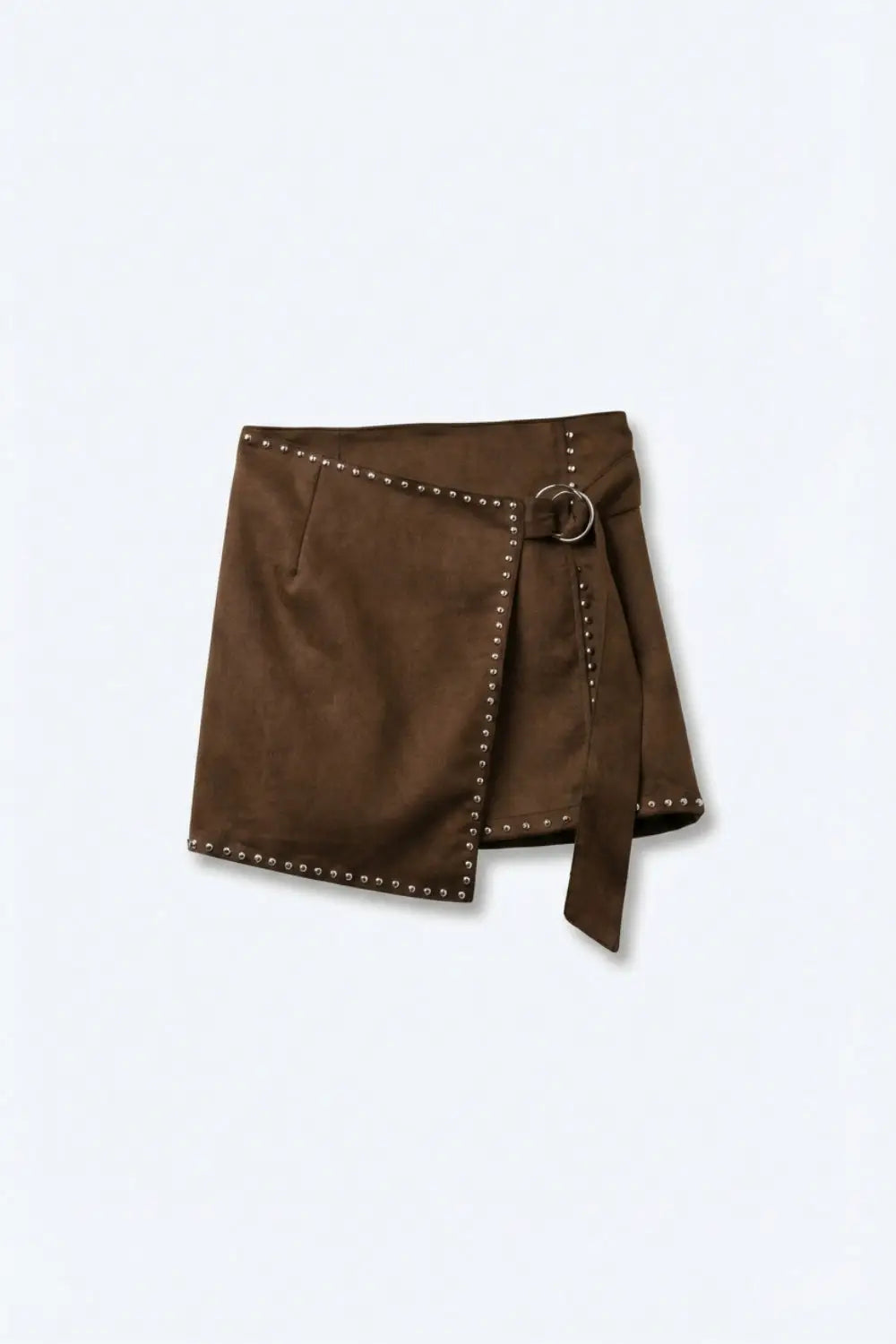 Brown Studded Wrap Mini Skirt with Belt Detail