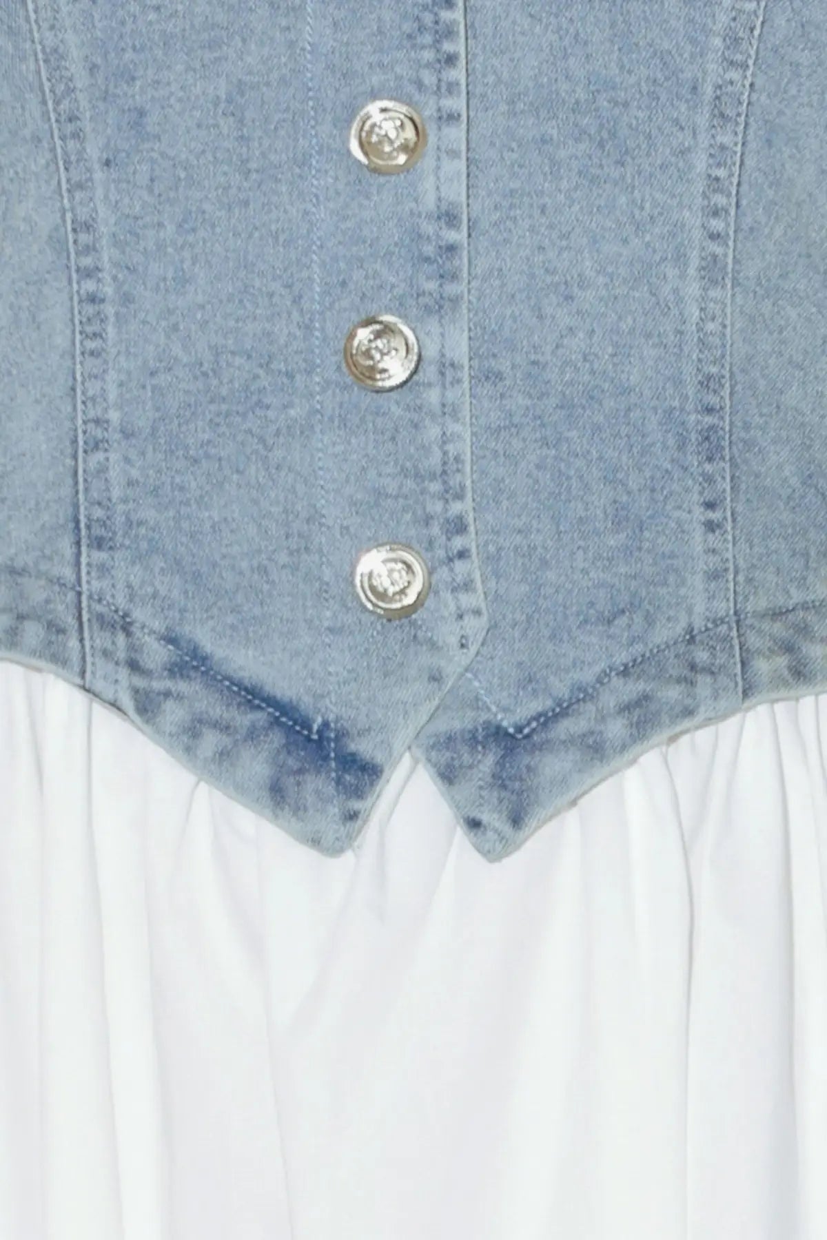 A woven midi dress featuring washed denim halter vest with button down, solid woven full skirt, bare back with zipper closure