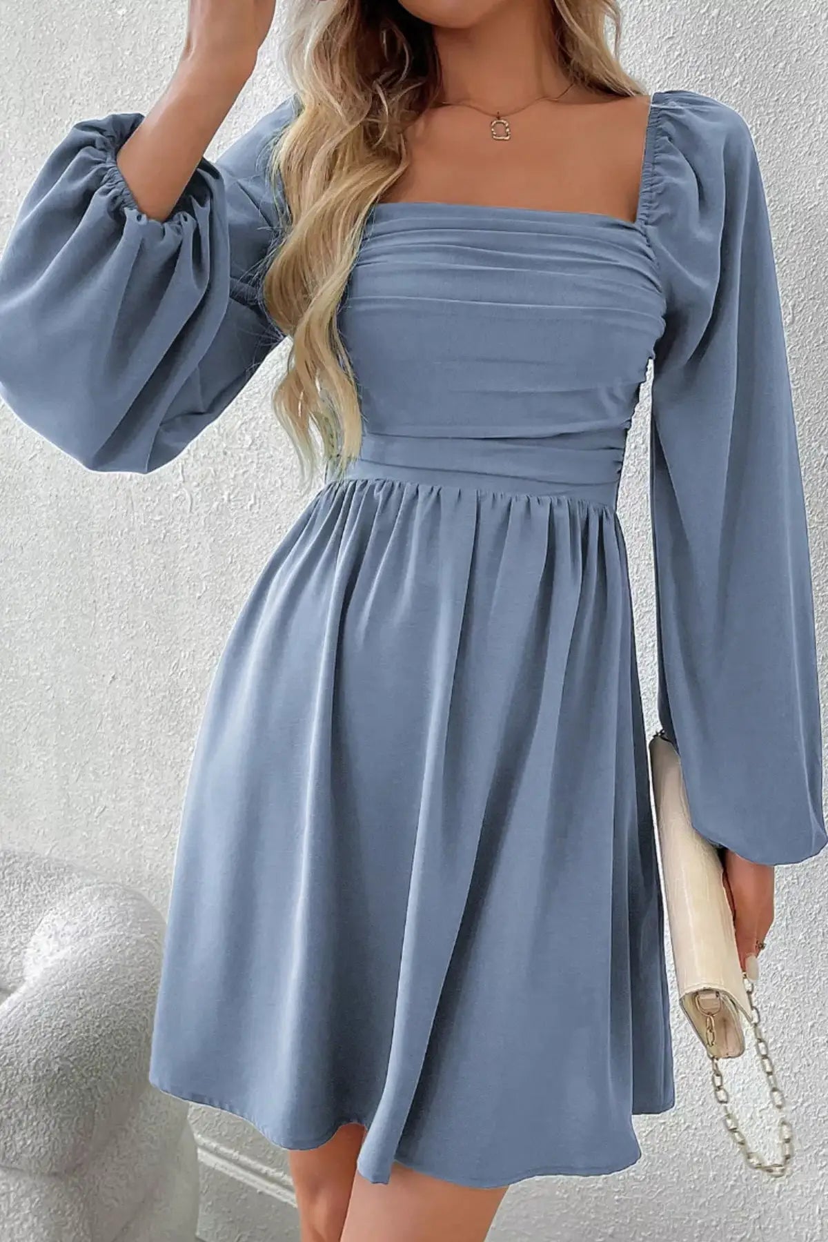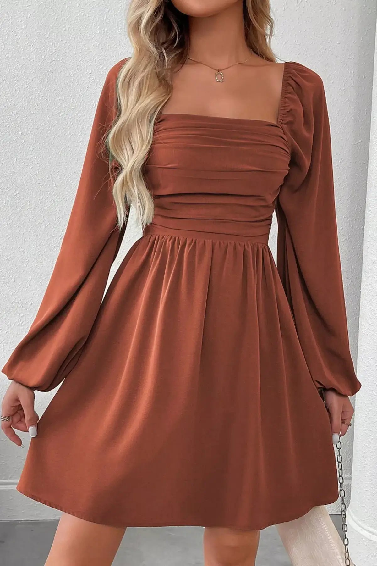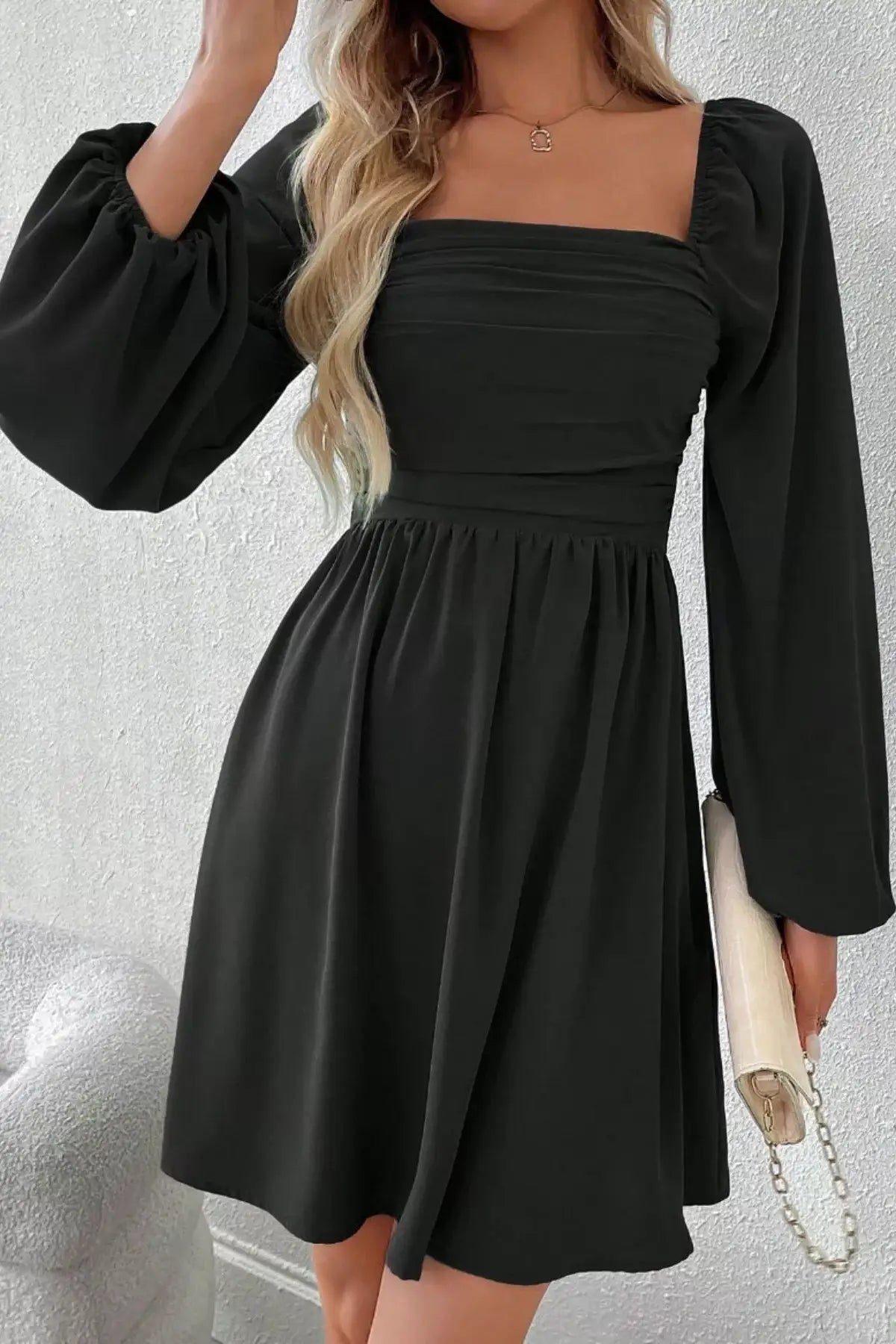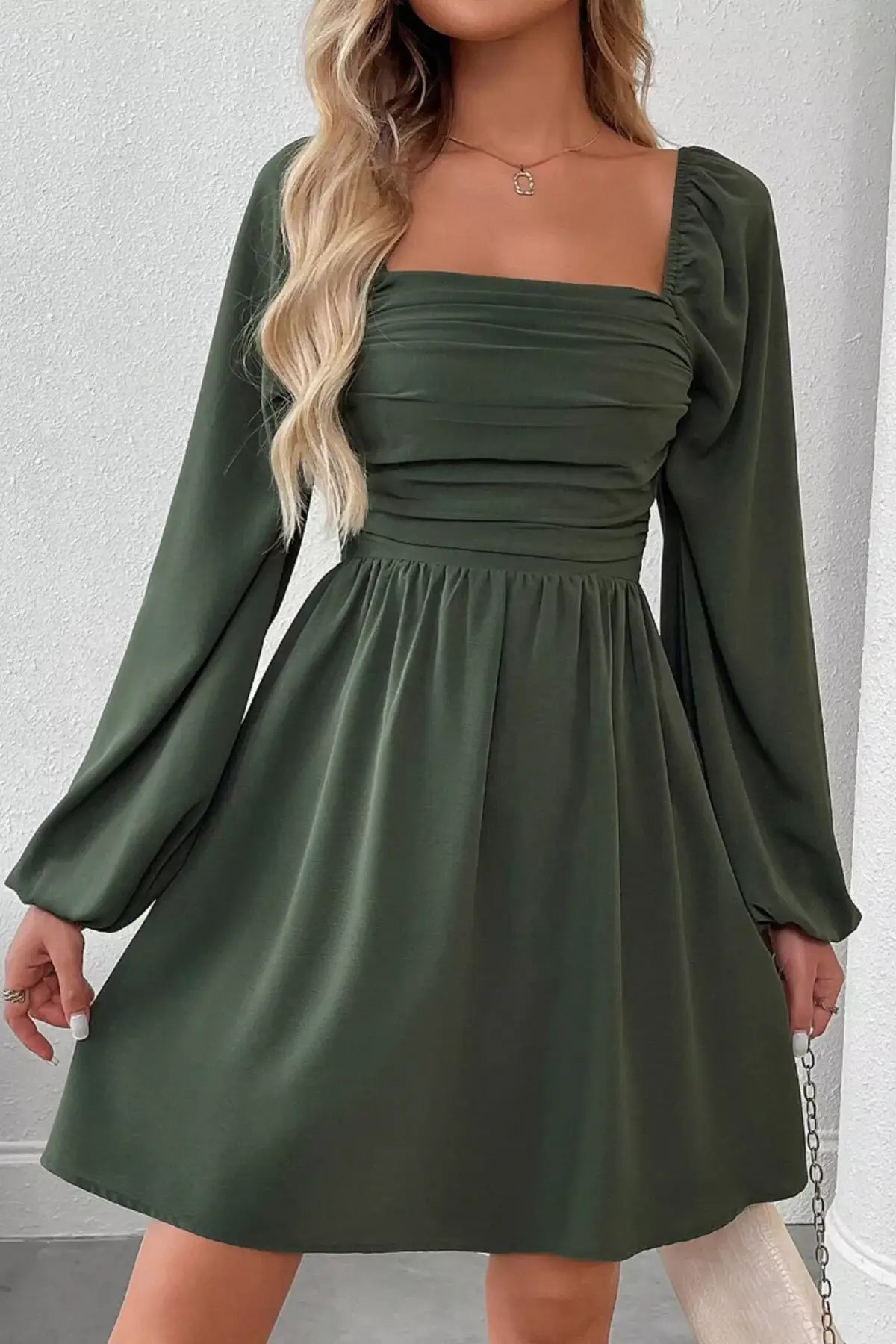 Ruched Square Neck Long Sleeve A-Line Dress