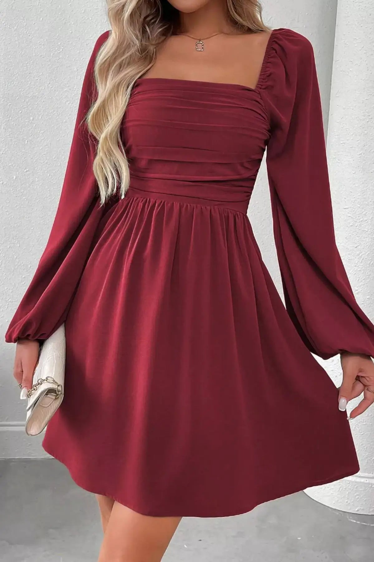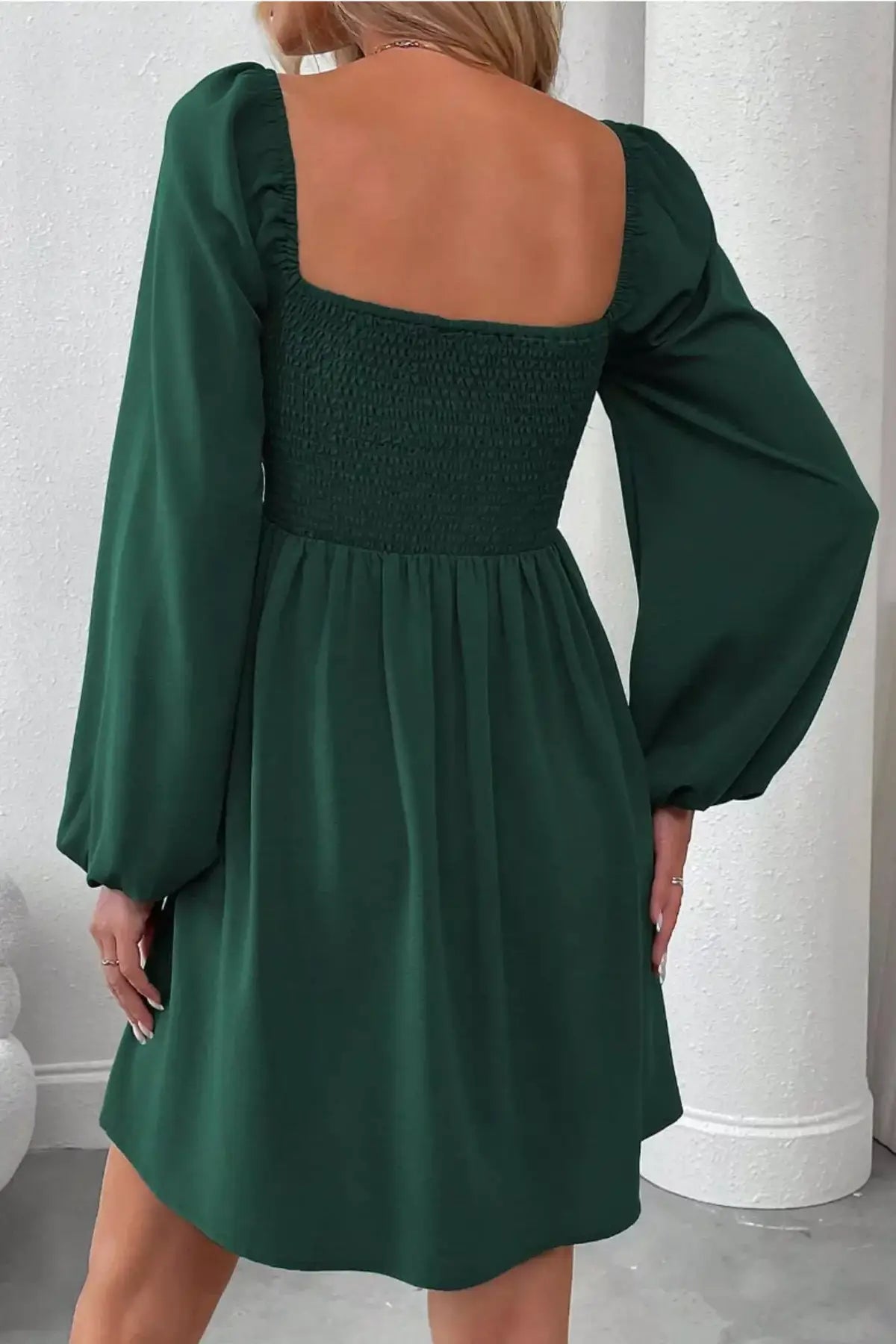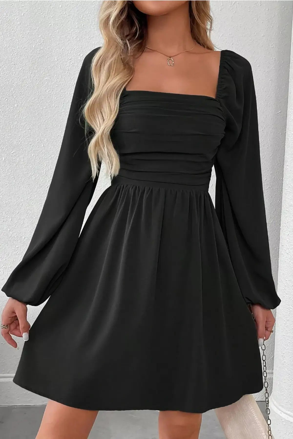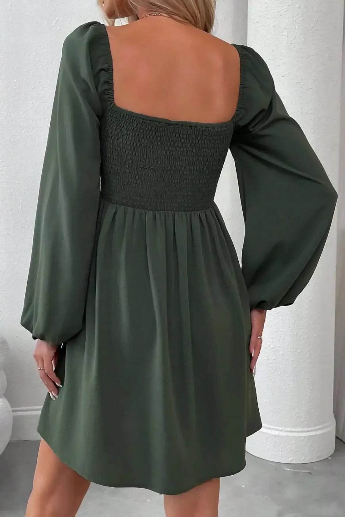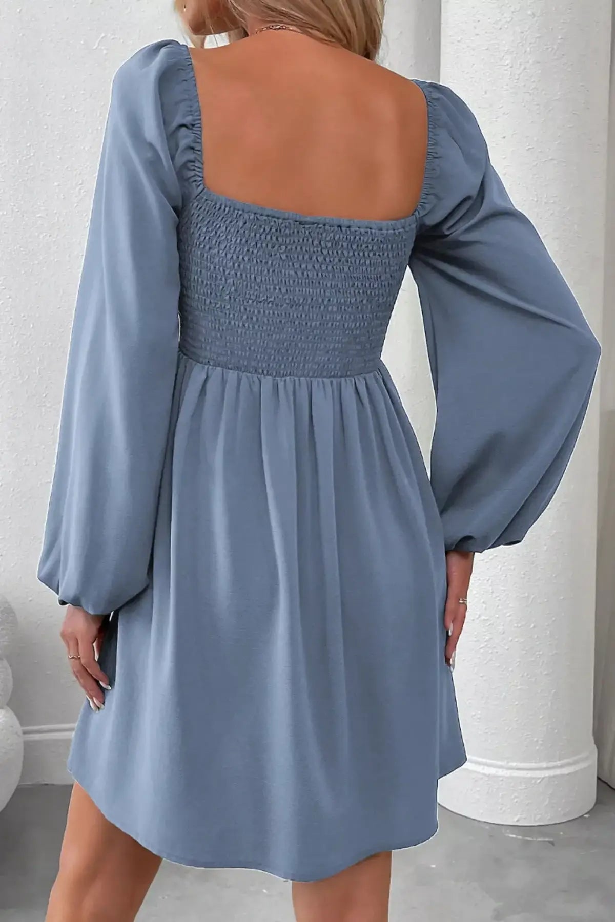 Ruched Square Neck Long Sleeve A-Line Dress