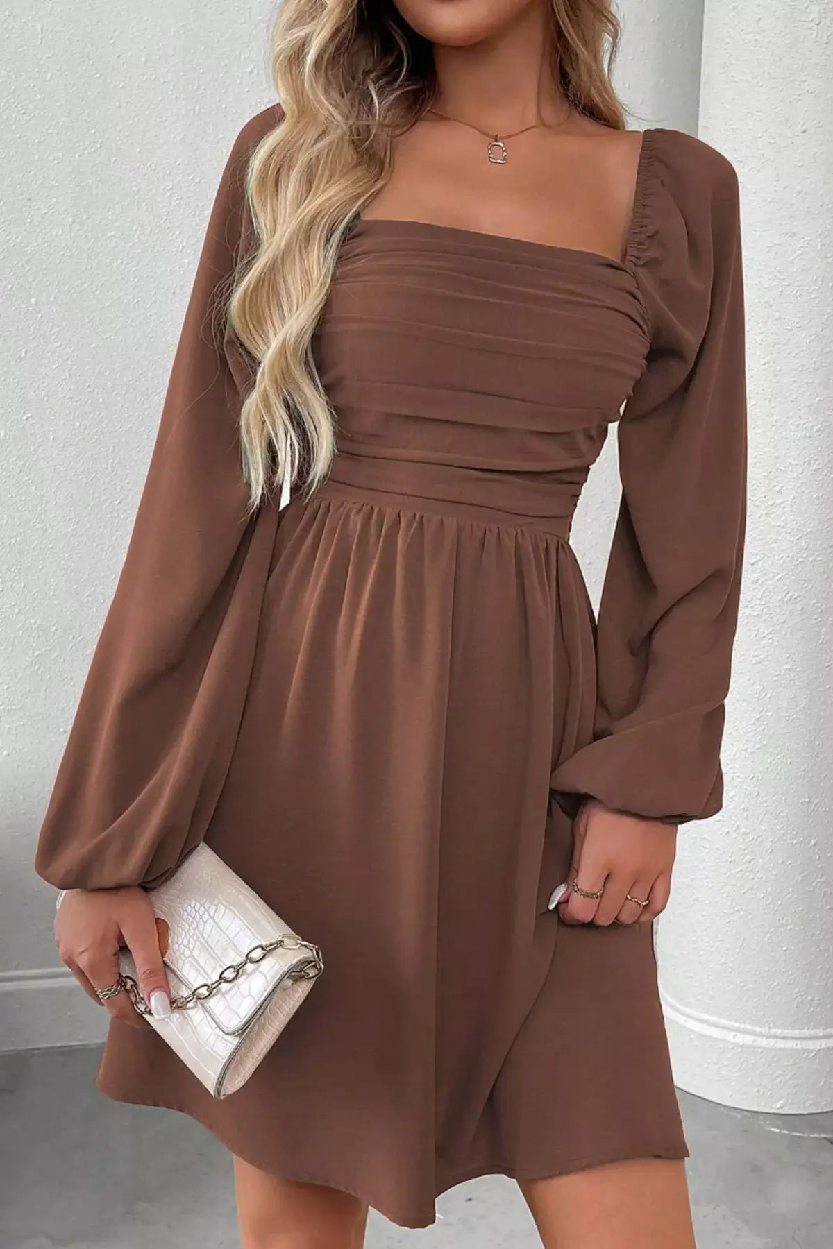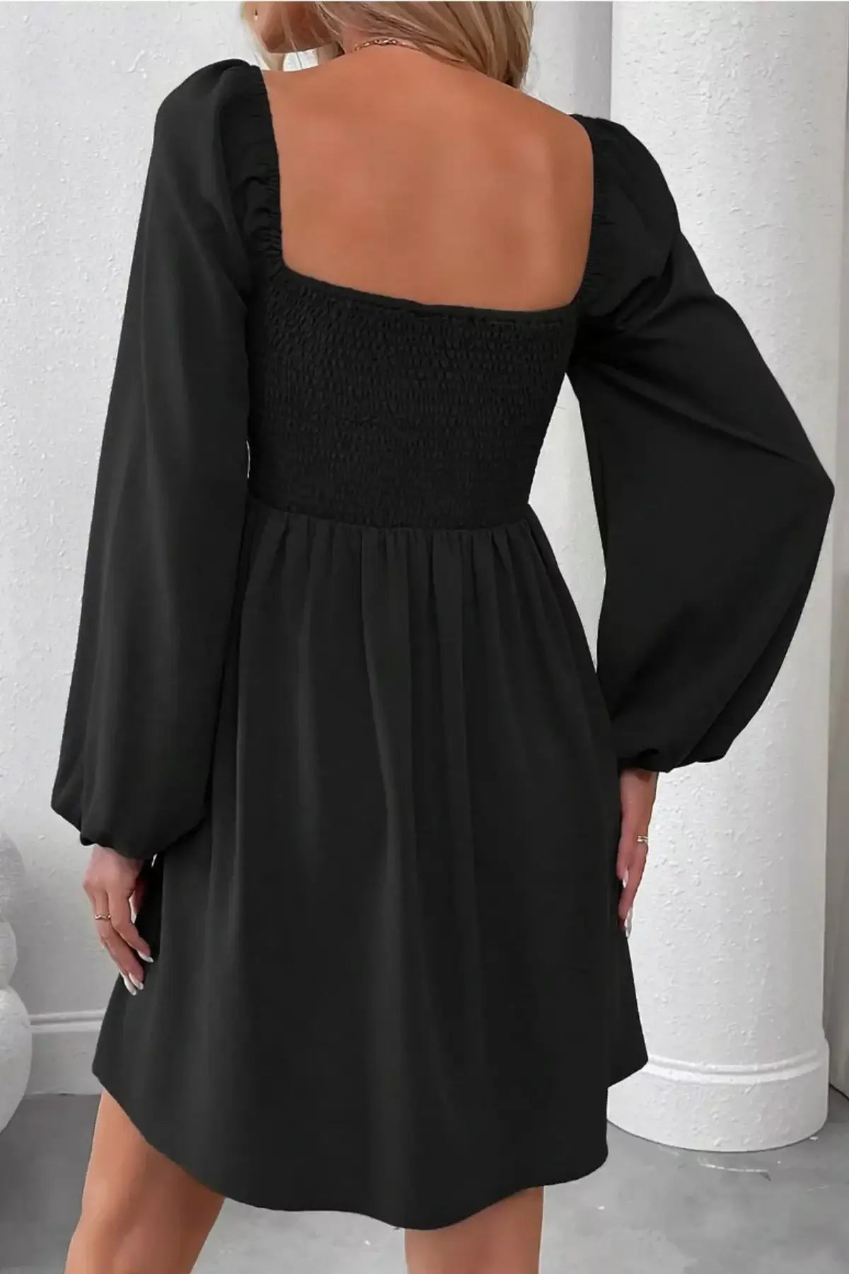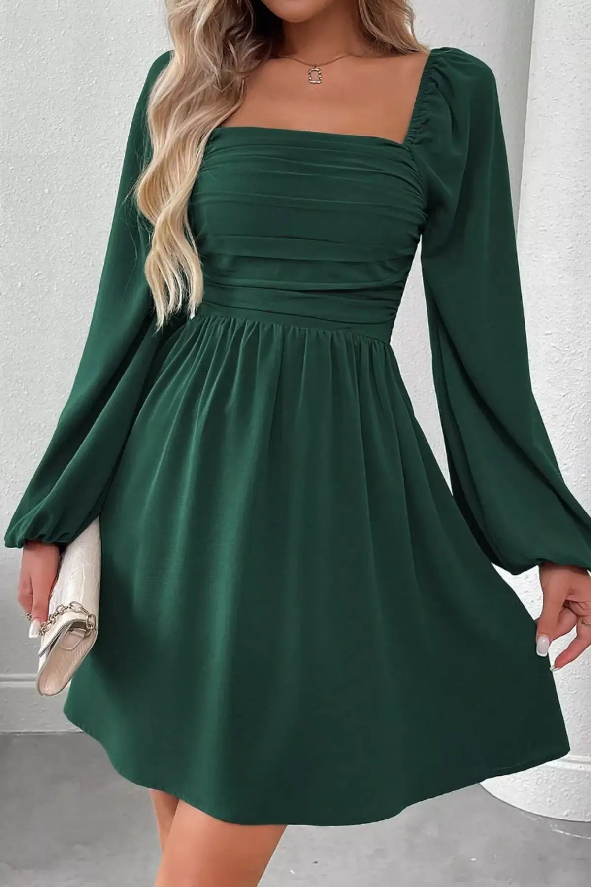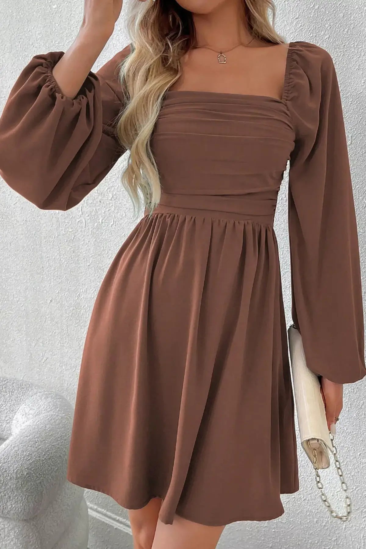 Ruched Square Neck Long Sleeve A-Line Dress