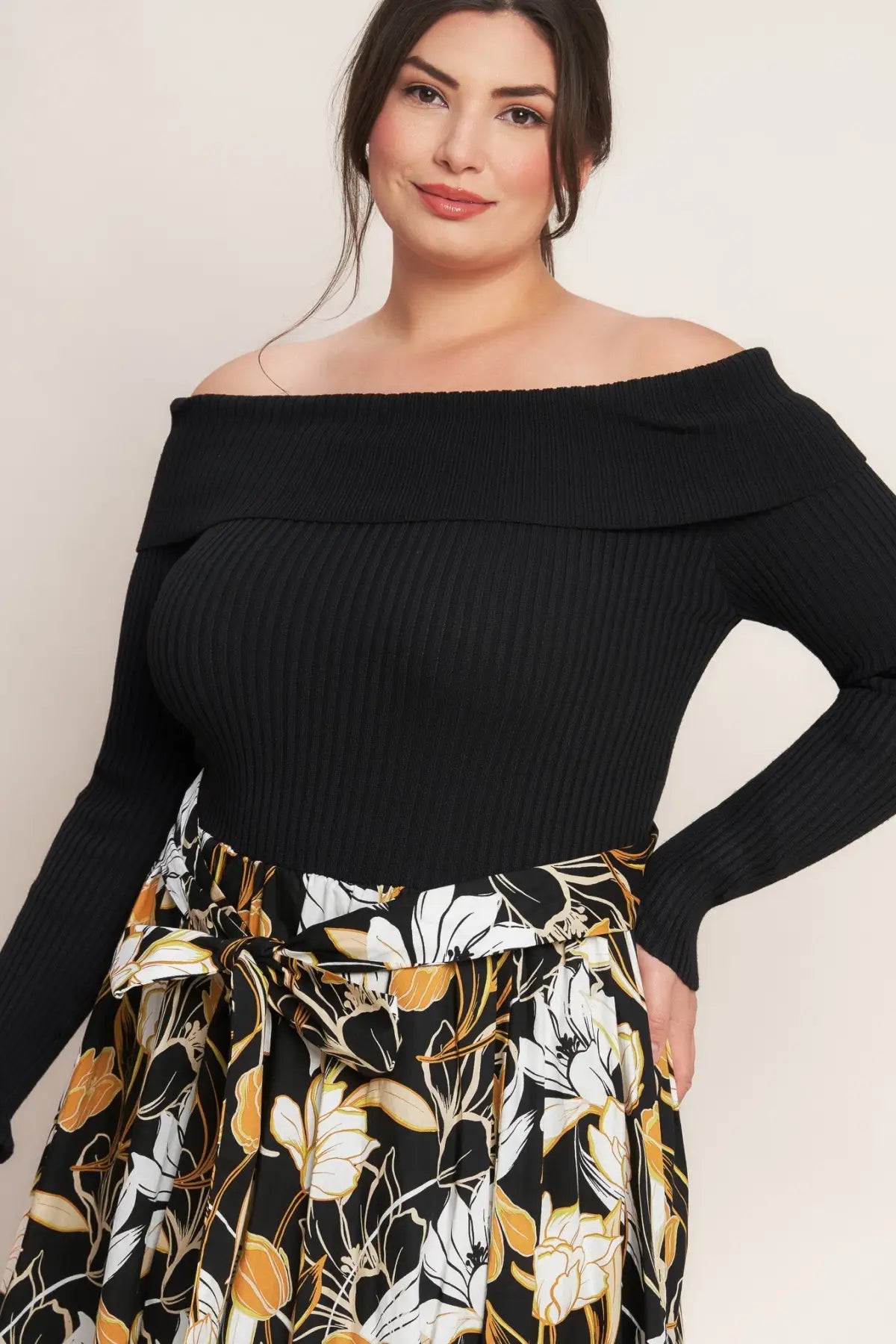A sweater/printed woven combination midi dress featuring off shoulder neckline, long sleeve, and full skirt