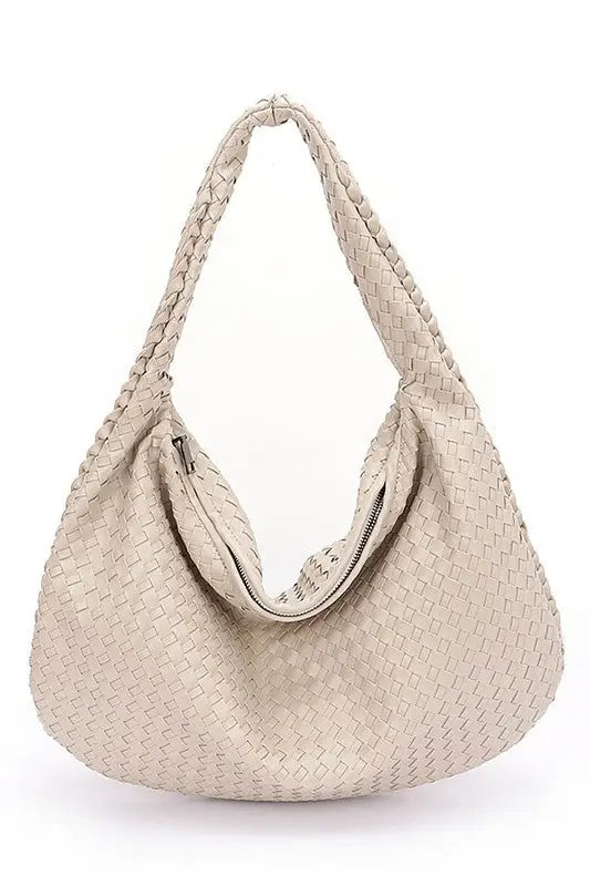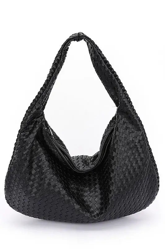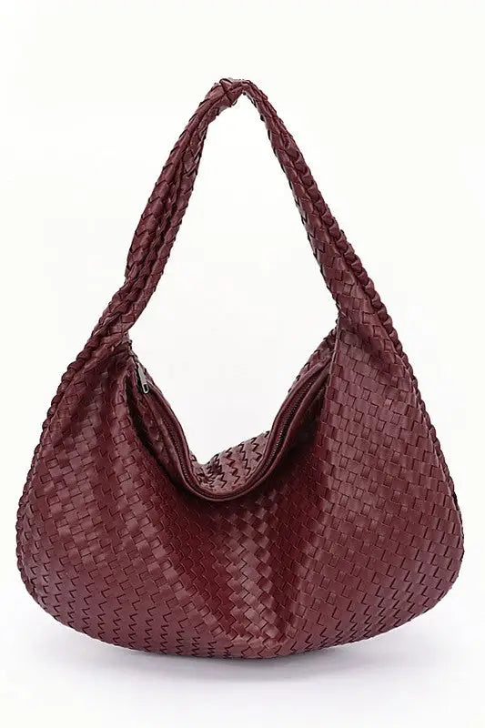 Measuring 18" wide, 11" high, and 1" deep, this shoulder bag features a playful woven faux leather design crafted from soft polyurethane with charming mixed metal accents.