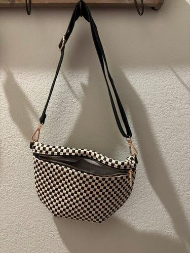 Meet the Westlyn Woven Bum Bag! Gorgeous woven vegan leather available in solid colors with a unique block design on the strap gives us edgy, rocker vibes. We also have it available in checkered prints, and metallic! Beautiful hardware with a zipper closure with beige and black chevron interior, and a zippered slash pocket on the inside. This crossbody bag is the perfect accessory to elevate any outfit!