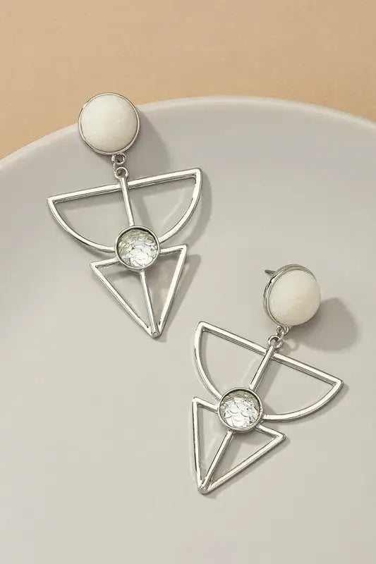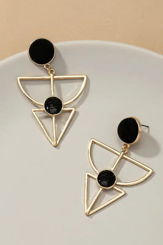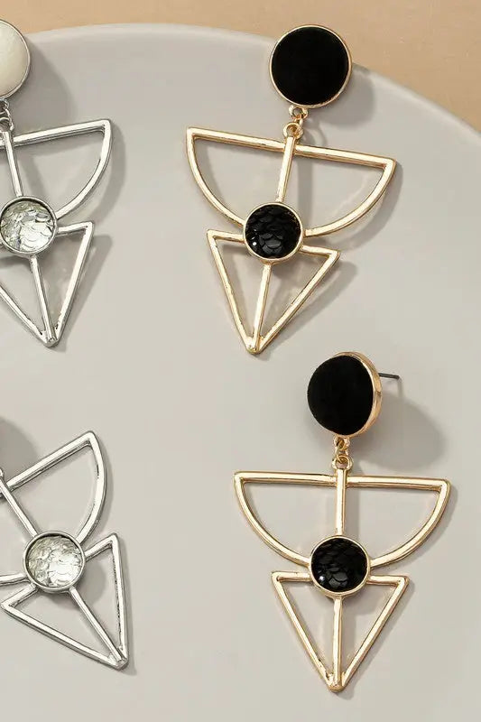 Stand out with this detailed geo cutout earring featuring a velvet stud, geo cutout, and a scale patterned stone embedded in the geo cutout.