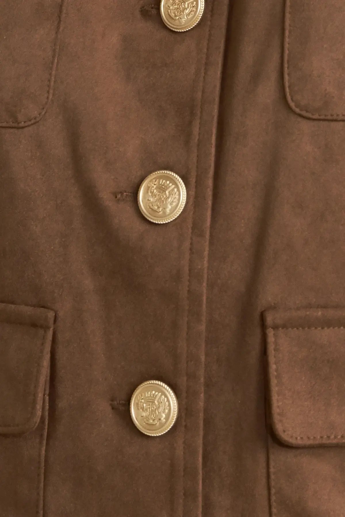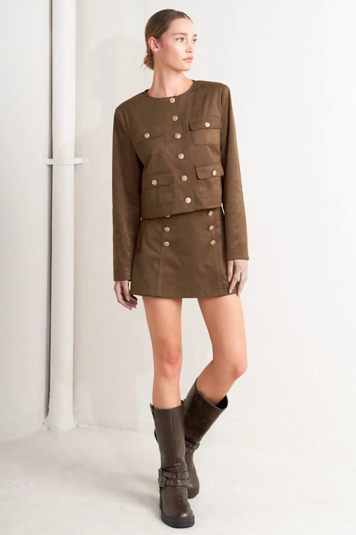 A faux suede cropped jacket featuring round neckline, long sleeve, front pockets and button down.