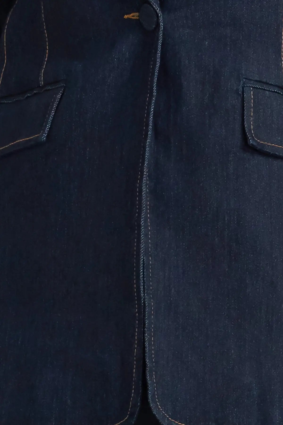 A denim blazer with single button closure and slit at sleeve. Matching pant FP1684