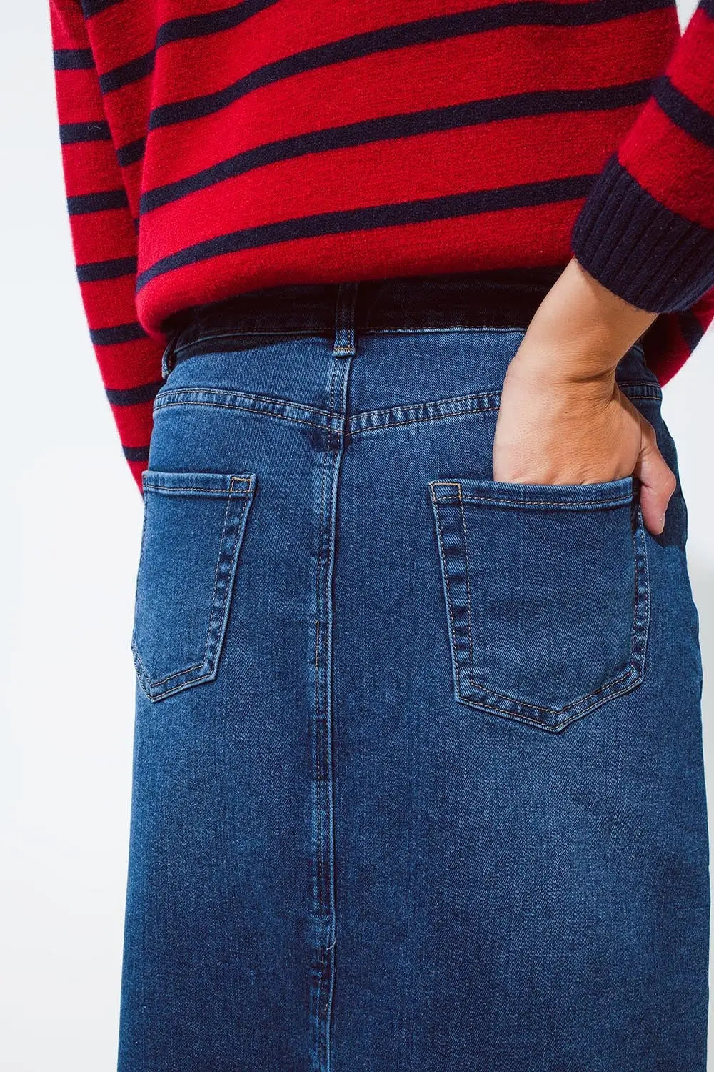 Q2 Blue maxi demin skirt with a long zipper chunky zipper down the front in Medium wash