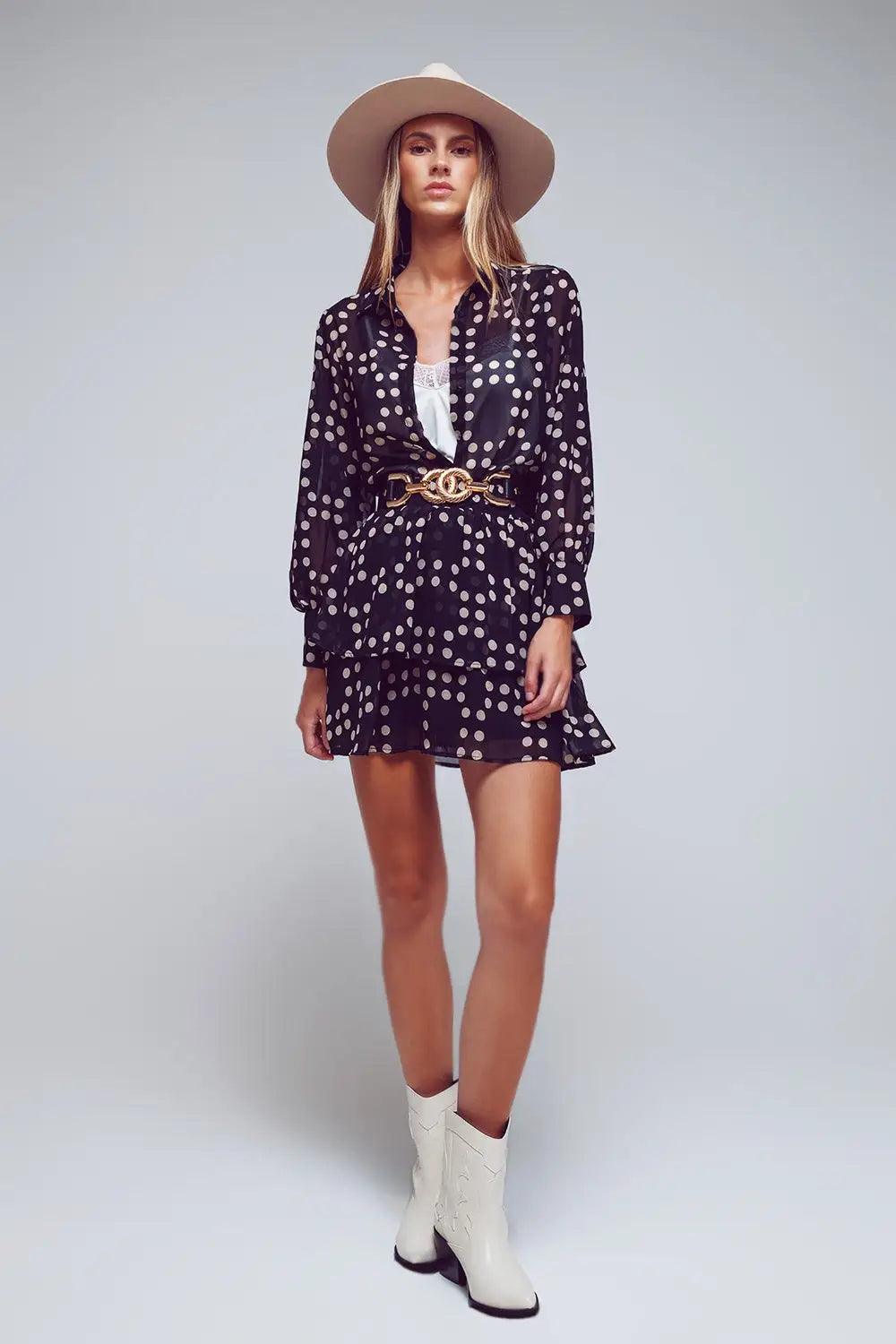 Tiered Mini Skirt in Black and Cream Polka Dots