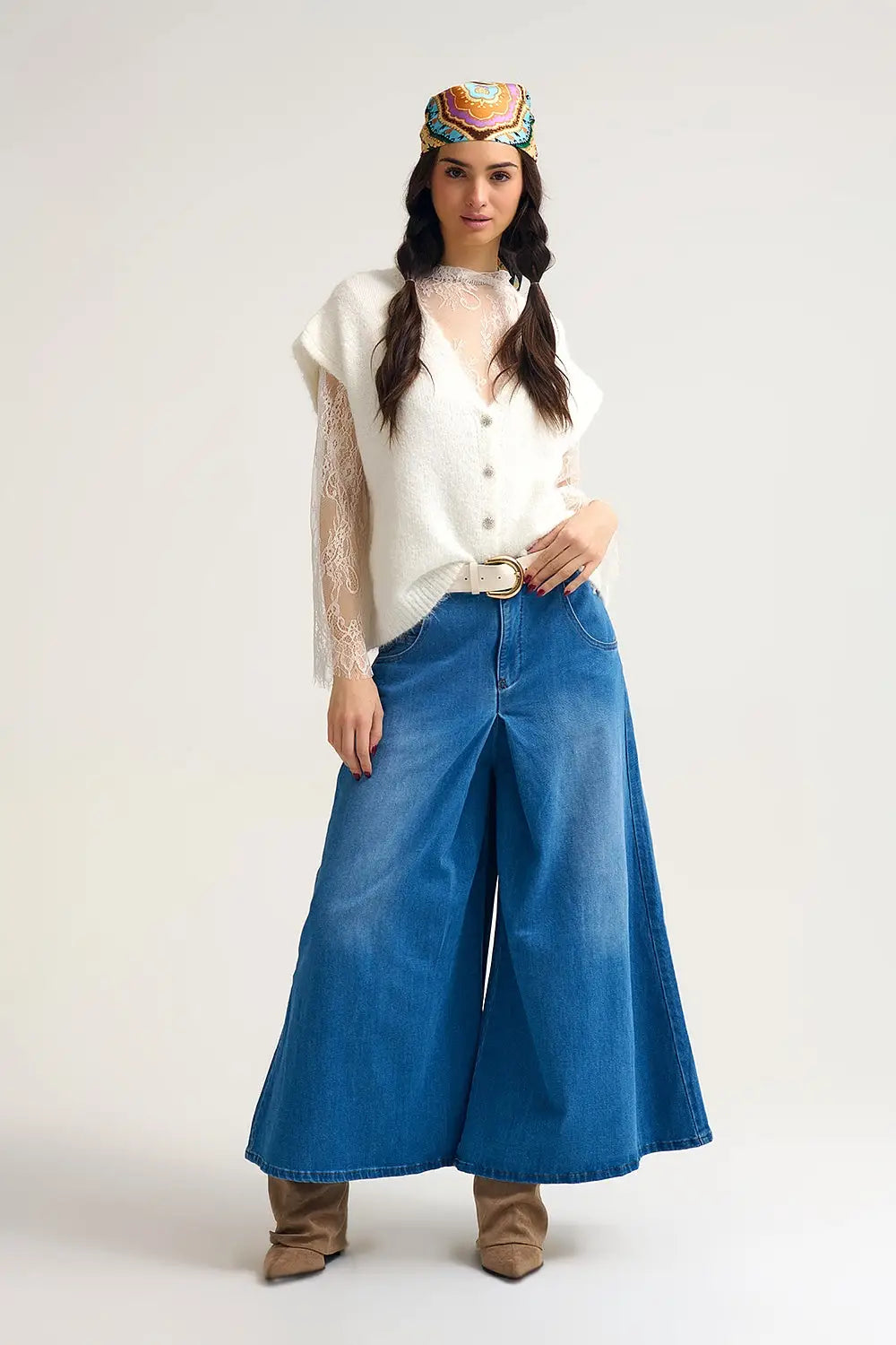 Extra Wide Leg Denim Skort with Front Pleat - Jeans