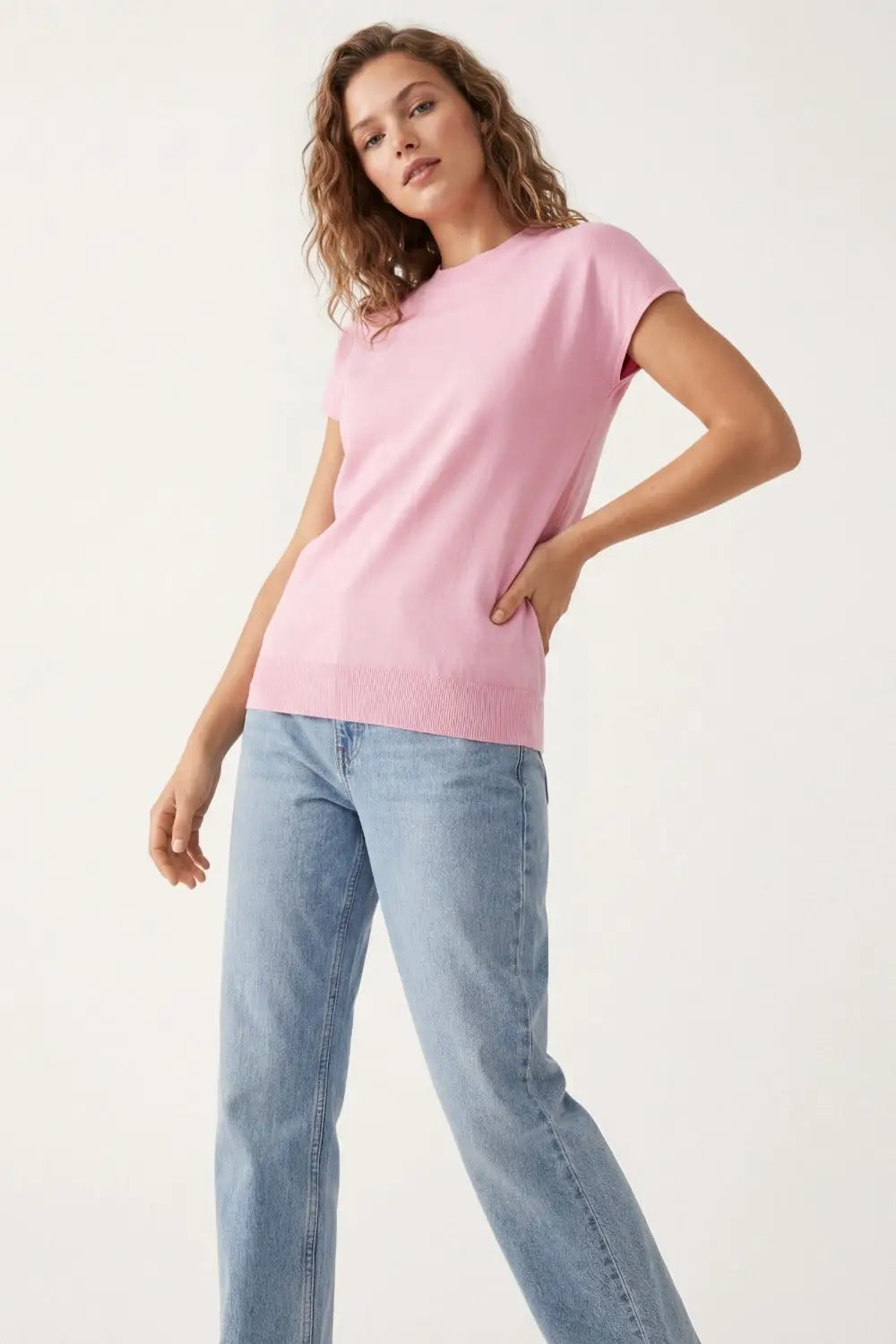 Baby pink turtleneck sweater with fitted short sleeves