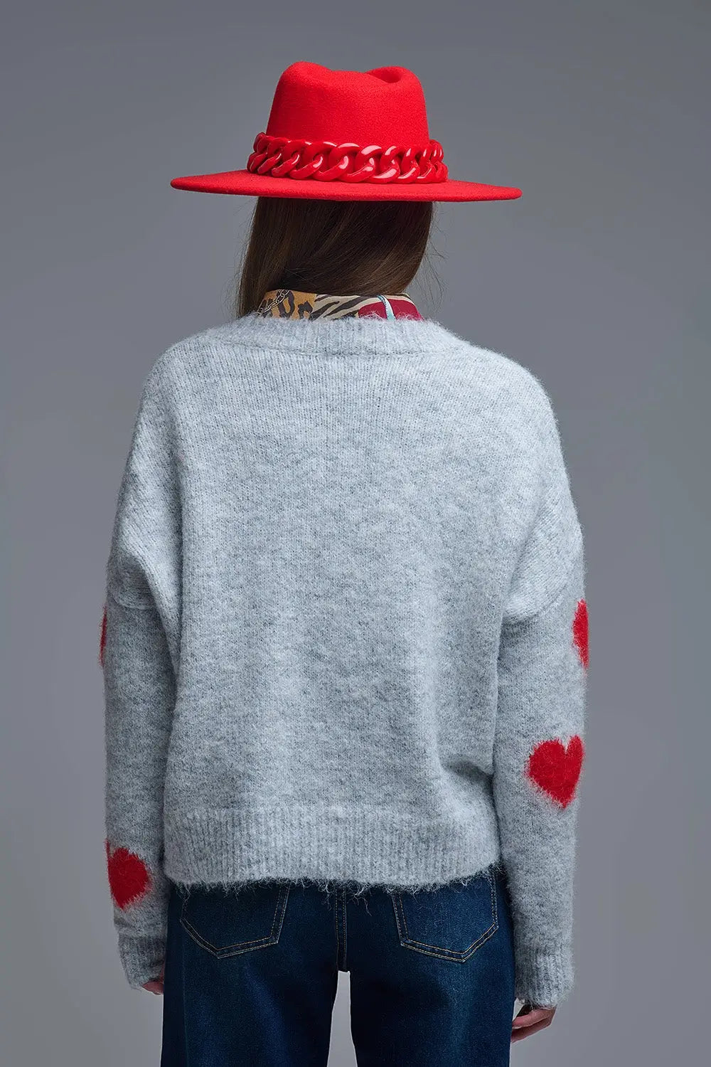 Q2 V-neck Long Sleeve grey Sweater With Red Hearts