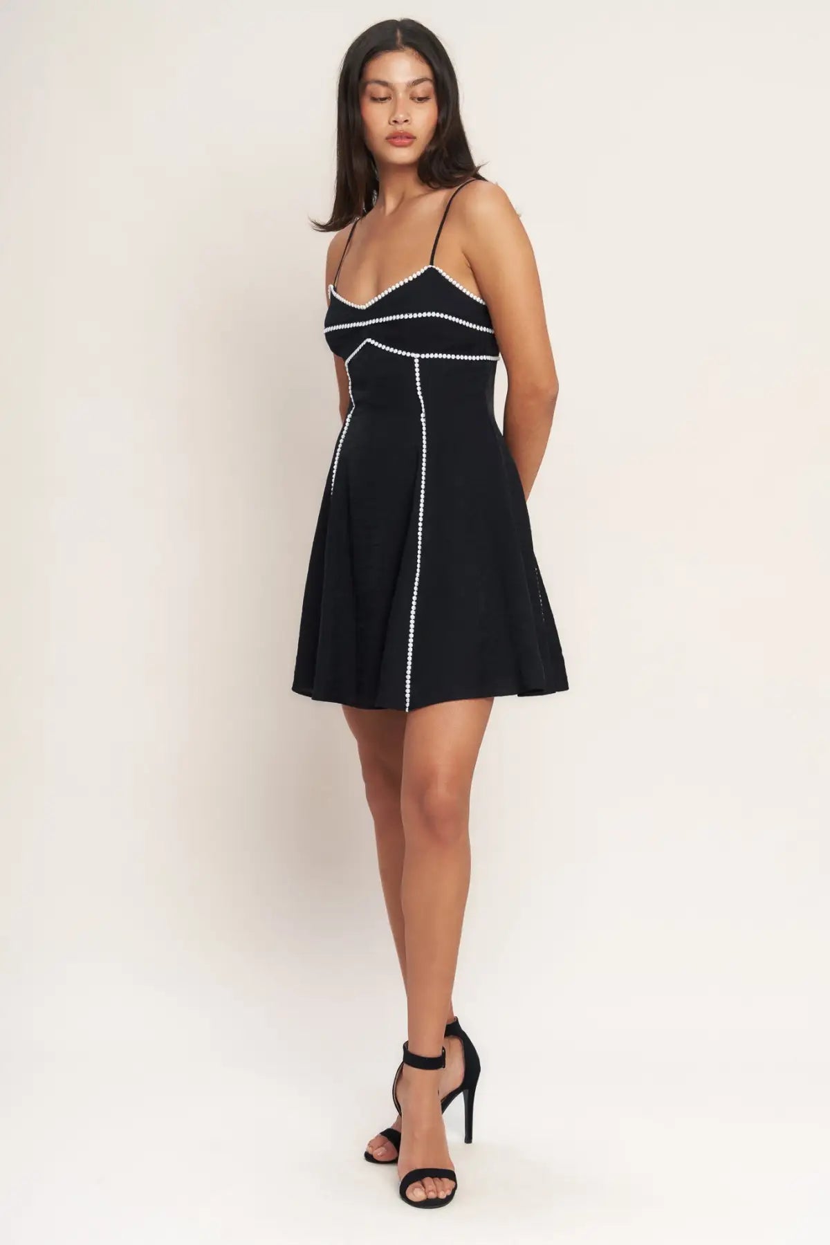 A solid woven mini dress featuring cami top, straps, lace trim, circle skirt and back zipper closure