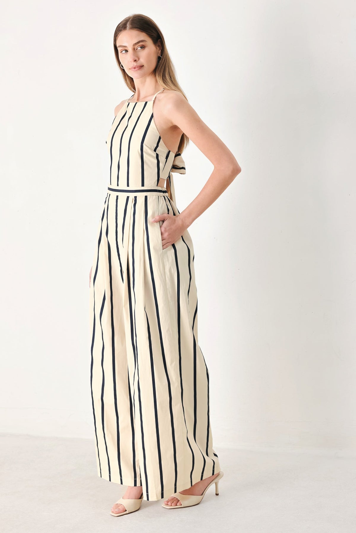 A printed woven jumpsuit featuring straight neckline, side pockets, bare back with tie and wide leg Details: Self : 100% Cotton Lining : 100% Polyester Size & Fit - Model is 5`8" And Wearing Size Small - Measurements Taken From Size Small - Approx. Length: 51"
