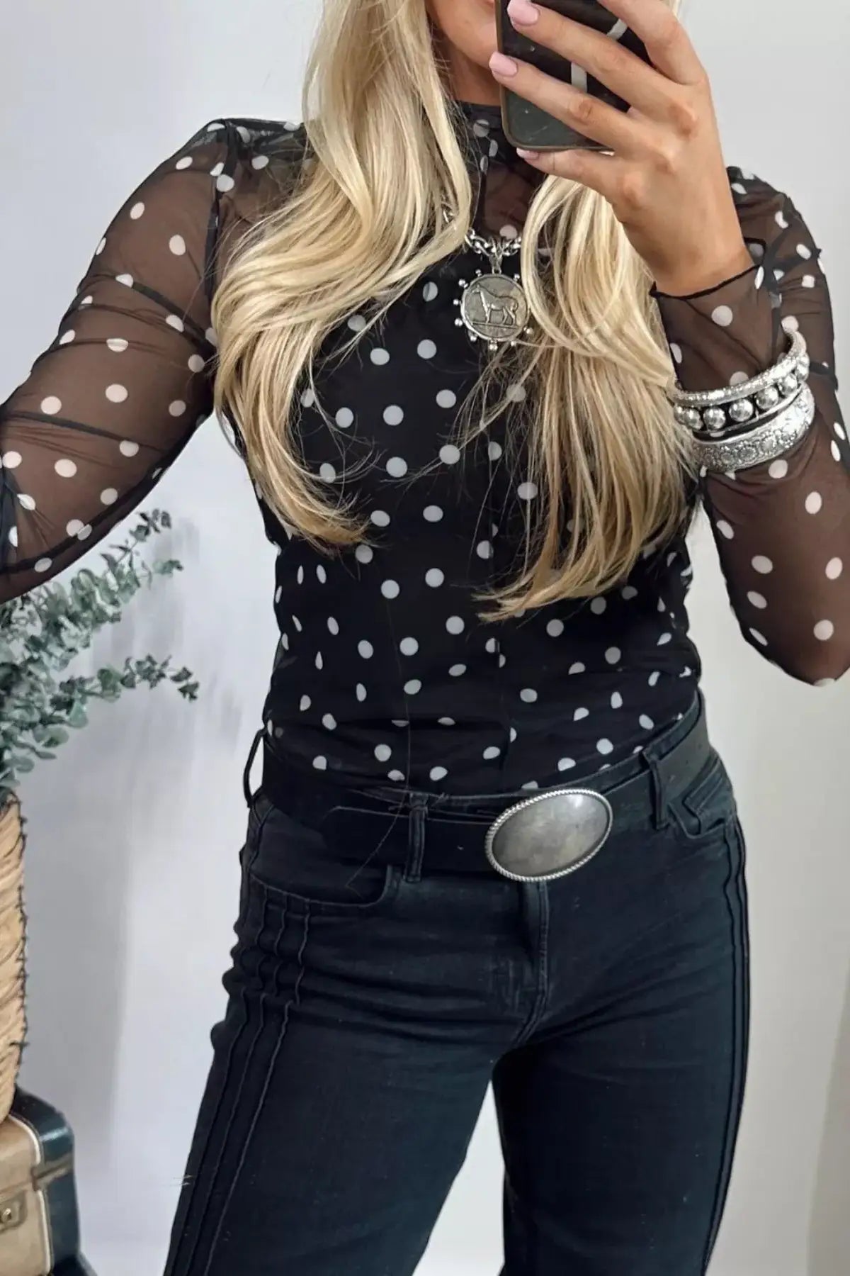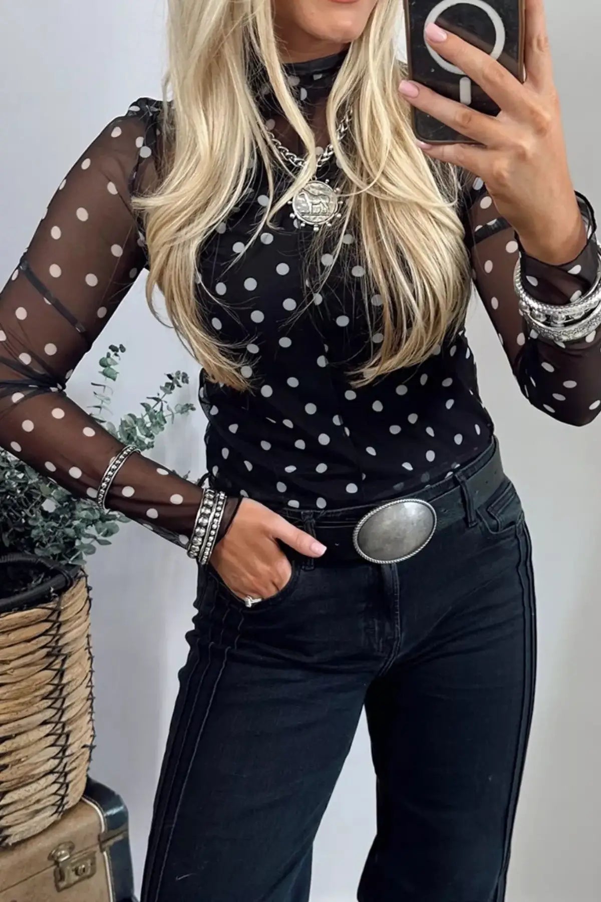 Polka Dot Patterned Bodycon Mock Neck Mesh Long Sleeve Top
