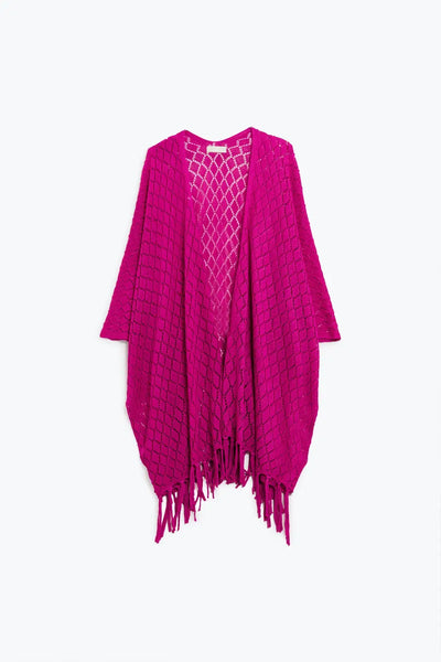 Fuchsia Open Cardigan With Fringe Ends and 3/4 sleeves