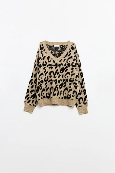Soft knit v-neck sweater with leopard print